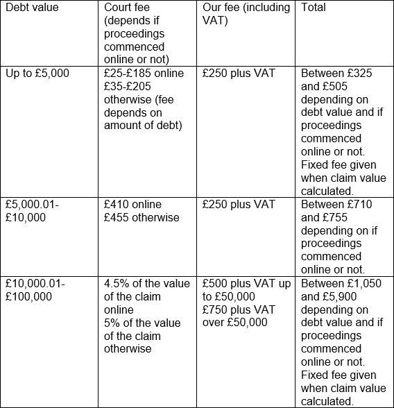 The costs quoted above are not for matters where enforcement action, such as the bailiff, is needed to collect your debt.